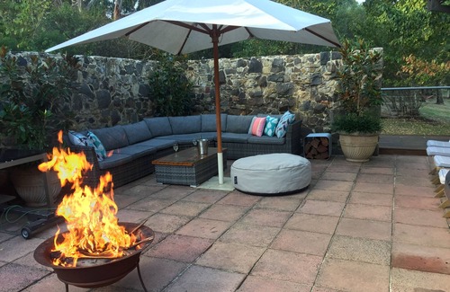 Stoke up the 6 burner stainless steel BBQ and sit out on the entertaining decks amongst the natural bush setting while your kids run around the large fully enclosed backyard playing on the swings,having a game of cricket ,feeding the sheep and alpacas or paddling on the dam in the inflatable dingy.The outdoor entertaining areas feature large dining tables,deck chairs,a contained wood fire pit,a large 10 seater lounge with coffee table and large shade umbrella.