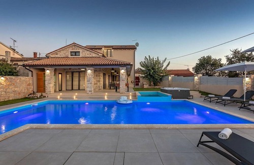 Villa M is a luxurious and beautifully furnished holiday home that combines modern style with traditional charm. Located just 650 metres from the nearest restaurant and 2 km from a grocery shop, this villa offers ultimate comfort and convenience. The villa is set in fully fenced grounds and features a large swimming pool, a 6 m² children's pool, a hot tub and a sauna. Enjoy al fresco meals on the covered terrace with dining table and barbecue. Other amenities include a guest toilet and three parking spaces. The villa is spread over three air-conditioned floors. The ground floor comprises a stylish living room, a dining table, a fully equipped kitchen and a double bedroom with en-suite bathroom. The first floor has two double bedrooms, each with its own shower/WC. The second floor (top floor) offers a double bedroom, a bathroom with bath and separate shower, a storage room with washing machine and a balcony with panoramic sea views. Villa M is located in Mihelii, only 6 km from Porec and 7 km from the nearest beach. It offers an ideal location for exploring the rich cultural heritage of Porec, including the famous Euphrasia Basilica. Please note that this property does not accept youth groups or stag and hen parties. A youth group at this property consists of persons aged 26 years or younger.