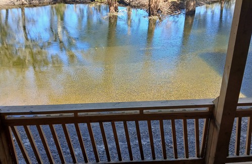 Large windows overlook the Suwannee River, while a private entrance and covered porch provide space for outdoor relaxation. The porch includes seating where guests can enjoy river views and local wildlife.