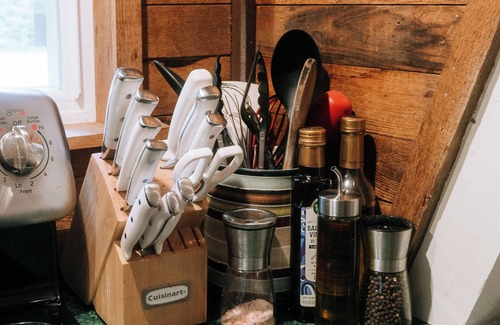 This cabin features a fully-equipped kitchen, propane BBQ, wood-burning fireplace, and three beds. It also has an indoor/outdoor bluetooth stereo and a TV with Roku and DVDs.