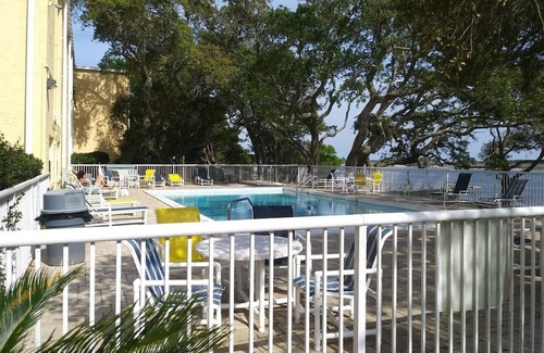 It's a one bedroom, one bath on the bottom floor unit for easy access, in and out to your vehicles. It's 4.2 miles to our gorgeous boardwalk and beaches. A few yards from the Sound and crystal clear emerald water. The grounds are immaculate, the rasied pool overlooks the sound. Extremely peaceful and Tranquil. The grounds & sound are absolutely gorgeous, the breeze coming off of the water is undeniably amazing, especially at night.