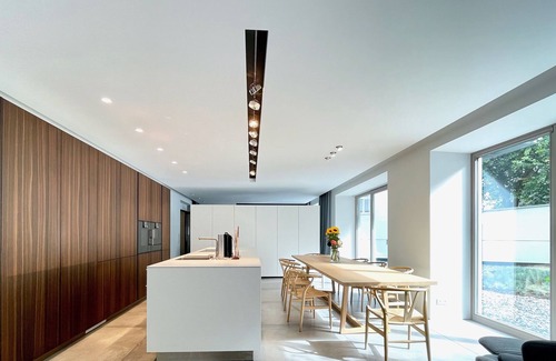 6 MO. MINIMUM - NO EXCEPTIONS! DO NOT ASK!!!! 8 rooms, 250m2, surrounding stone garden, 5min to U1/U7. enter via private garage w/ EV charging and basement. wide open bright family/kitchen/dining room. fully equipped bulthaupt kitchen, custom dining table seats 8, minotti couch and 77” surround sound tv in family room. east-wing hallway with miele w/d, 2 kids BDRs, 2 full bathrooms and gym/3rd BDR. west-wing with large home office, 2 walk-in closets and master bedroom suite with japanese bathing rm.