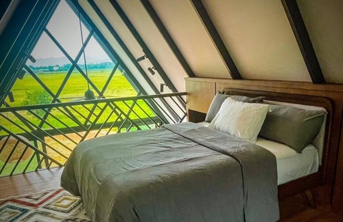 Modern glasshouse in a quaint Malaysian village surrounded by lush golden paddy fields. Aesthetic architecture design meets nature. Waking up with a view overlooking the majestic Machincang Mountain. Seamlessly blending nature with sustainability lifestyle and eco conscious. And last but not least Jacuzzi to for :)