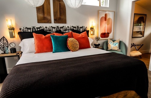 Located on Main Street in the heart of The Valley. Tucked above our locally loved coffee bar, a cozy king suite perfect for solo travelers or couples looking for a quaint, bed-and-breakfast style escape. Featuring a plush king bedroom, a full private bathroom with a stand-up shower (rain shower head), and a kitchenette equipped for light bites and midnight snacks. A private entrance opens directly into our caged courtyard, giving you a quiet, off-the-street entrance and a peaceful nook to enjoy your morning brew. If you're looking for additional sleeping space check out our other two neighboring suites, the Courtyard Suite & Mountain View
