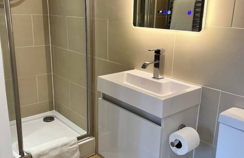 The bathroom is equipped with an enclosed shower cubicle, heated towel rail, WC and basin. This is complemented with organic bathroom luxury products. The bathroom benefits from a smart mirror that features a Bluetooth speaker and a shaving point.