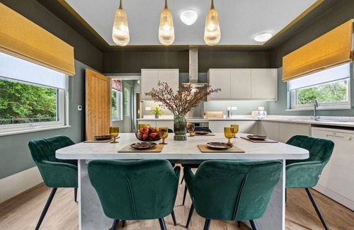 Once a bustling passenger lounge and station office, this open-plan area now blends history with function. The kitchen stands where the old ticket hatch was once fixed, now relocated and preserved in Bedroom 3. The former waiting room has become a cosy living area, complete with Smart TV, cosy sofas, and a striking wood-burning fireplace, perfect for relaxing evenings. The fully equipped modern kitchen and elegant dining area provide ample space for group meals, social gatherings, or casual breakfasts.