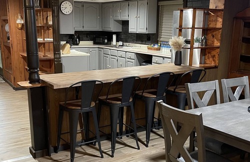 This cozy home has been newly renovated with its very own private bar and outdoor pavilion with a fireplace. Perfect for peaceful cozy nights by the fire with your family and friends.