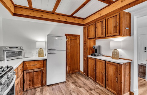 This log cabin backs up to the forest and is situated on a street with very minimal traffic. The kitchen is fully equipped with everything you need, waffle maker, air fryer oven, blender, pots/pans, coffee pot, Keurig, toaster, electric hit water kettle.The rooms are very clean and updated. Luxurious down comforters, down pillows, and 100% cotton sheets.