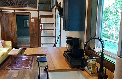 The Living Space: Relax in the cozy and cute living space that includes a futon style couch for additional sleeping space, a custom built coffe table, flatscreen TV, warm lighting and plenty of charm. There is a small closet with coat hangers for guest to utlize. We are building a collection of games that are currently stored beneath the ladder to the loft.