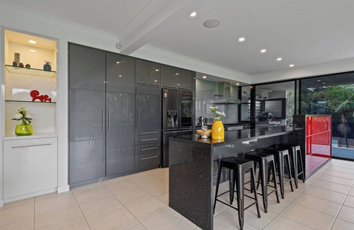Our home is a two-storey, 6 bedrooms, beachfront dream. The floorplan consists of an open plan kitchen that doubles up as an entertaining space. There is also has a huge deck overlooking the the pool, spa as well as the trees surrounded by the lake at the back of the home (direct access). A simple stroll down side gate, through the public park and you are on the beach, the perfect location!