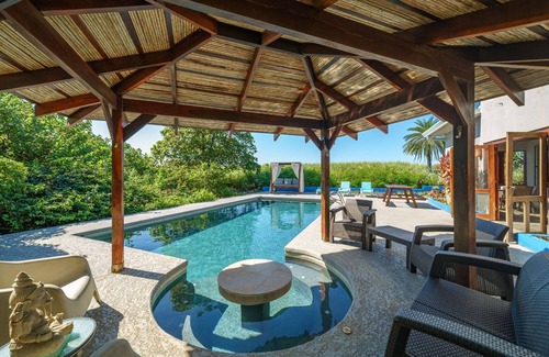 The property includes a 2BDR, 2BTH Main House (for groups up to 4), a 1BDR, 1BTH Guest House (for up to 2 additional people) with a total occupancy of 6, and a newly renovated pool. It is located steps away from the ocean in Playa Junquillal, an internationally noted nature and turtle preserve.