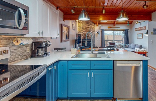 Step into this welcoming retreat and feel at ease in the sun-soaked living area featuring high wood-paneled ceilings, beautiful skylights, plush seating, and charming rustic decor. Cozy up on the sofa to stream your favorite movies on the smart TV, or gather around the wood-burning fireplace for board games and cocoa. The well-equipped kitchen, with modern appliances, a fully stocked spice rack, and ample storage, makes meal prep a breeze. Share home-cooked meals and laughter around the dining table, or head out to the patio for a barbecue with local brews and the catch of the day.