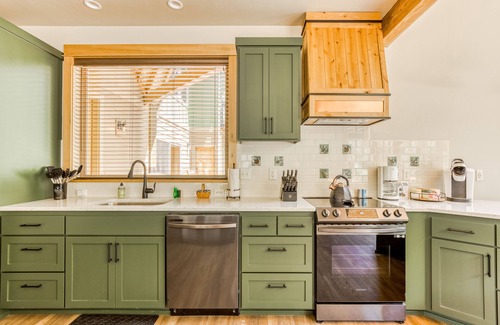 Inside the main house, a dramatic front wall of windows provides floor-to-ceiling views overlooking the McKenzie River. Comfortable lounge furniture makes the open-concept living room, dining room, and kitchen an inviting spot to enjoy the company of friends and family. Tie fly-fishing flies from the comfort of the sofa or find yourself watching a movie on cable. A gas-powered fireplace keeps the space intimate and down to earth. Complimentary in-home WiFi makes it easy to stay in touch on social media, browse the web, or catch up on some remote work. Celebrate meals as a group while the phenomenal views feed your senses around the charming wood dining table. Meal prep is made easier with help from a well-stocked kitchen and there's additional seating at the breakfast bar. Once the plates are cleared, leave the cleanup to the dishwasher while you dive into a good book by the fire or get lost in a puzzle or game.