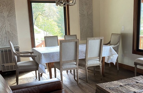 Built in 70s and recently remodeled, the house offers a contemporary open-floor design, high ceilings and skylights for plenty of natural light. Downstairs includes a kitchen, dining area, living room, and two large decks. Upstairs there is two open rooms, one bedroom, and a loft each with queen beds.