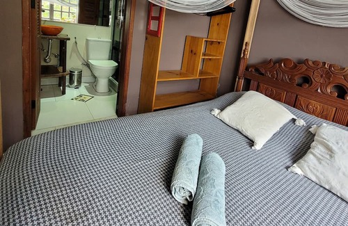 This beautiful suite with private bath and big window offers an incredible view over the Guanabara bay and the mountains. Watch the toucans and parrots flying by as you relax. Enjoy a refreshing swim in the big pool immersed in tropical forest or enjoy your breakfast or a sundowner on the pool terrace.