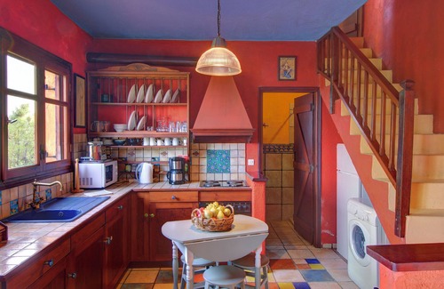 The exterior walls have been painted in bright colors, a technique taken from ancient times and which complement the surroundings. There is a BBQ to one side of the house and outside dining table, taking advantage of the shady pergola just outside the main entry door and in front of the private swimming pool and large pool terrace. Villa Pegasus has its own “privacy”, walls and a gated entrance from the private driveway and responding parking area.