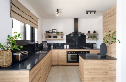 This modern villa for 8 guests, with a total area of 290 m², is spread over three fully air-conditioned floors. On the ground floor there is a spacious living room with access to the terrace and pool, a fully equipped kitchen, a dining table, and a separate toilet. On the first floor of the house there are four bedrooms with double beds, each with its own shower/toilet and a small balcony with a view of the pool and greenery.