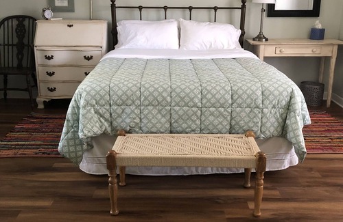 The circa 1930’s carriage house has been updated while maintaining its retro-chic vibe. It is clean and well-equipped, sans clutter. The studio-style main floor features kitchen, dining, and living space, with attached laundry. The sofa in the living room pulls out to a queen-sized bed. A spacious, loft-like bedroom and small but efficient en suite bathroom are upstairs. Full-sized appliances in the kitchen and an apartment-sized washer and dryer in the laundry room make it appropriate for any length stay. Local artwork adorns the walls, creating a sense of place.