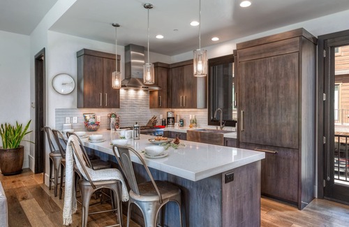Stepping into this home and guests are immediately welcomed into a sun-bathed, open-concept layout. A large sectional surrounds the beautiful gas fireplace and provides the perfect setting for a group to gather after a long day on the slopes. With access to the large balcony with additional seating, this living area is the perfect place to gather after a long day outdoors. The gorgeous modern kitchen with stunning white marble countertops, tile backsplash, and stainless steel apron sink. The dining area provides seating for six while the large island seats an additional five at the breakfast bar.