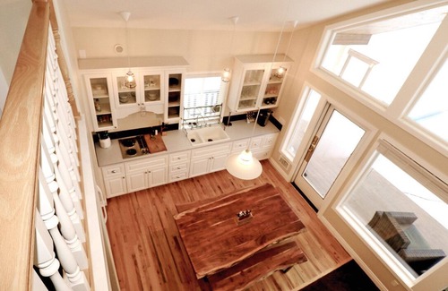 Master bedroom features a queen sized bed and flat panel TV. Upstairs loft features two beds (a double and a twin, side by side) and a large shared closet. Technically, VRBO considers this a 3rd bedroom, but we don’t have it listed that way on purpose, as we want to make sure you know that there’s no privacy between the two beds. The cabin is most comfortable for 5 guests but can accommodate up to 6 in beds.