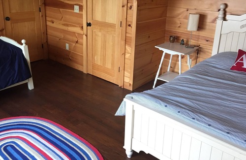Private waterfront with dock. Open floor plan with large stone fireplace, dining farmtable overlooking the lake, master bedroom with queen bed/jacuzzi bath and 1/2 bath on 1st floor. 2nd bedroom with queen bed and twin, bunk room with 5 twins, including triple bunk bed and full bath occupy 2nd floor. Main cabin sleeps 10. Detached garage with living space above, kitchenette, full bath, queen bed and trundle, sleeps 4 total. Outside patio with seating overlooks heated pool and lakefront. Swim, kayak, paddle board, canoe, play games in the yard in this quiet, serene, beautiful cove. 4 kayaks, 2 paddle boards, a canoe and pedal boat included. Nighttime fire pit and s’mores by the water’s edge. Year round rental. Minutes from North Conway outlets, downtown, and Cranmore and Attitash. A perfect vacation spot for families! (Pool opens mid May- mid October)