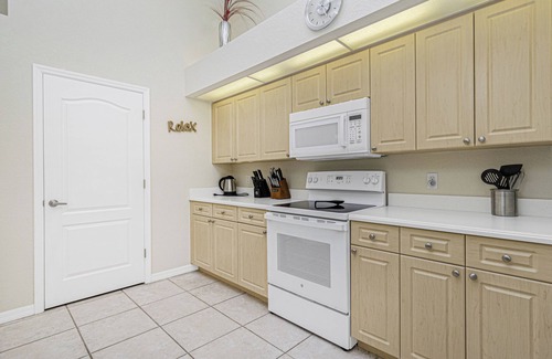 The spacious master bedroom has a king size bed with his and hers walk-in closets, and an ensuite bathroom with soaker tub and separate shower and walkout to the pool lanai. The second bedroom has a queen size bed with with access also to the pool lanai. The third bedroom has one twin bed and one double bed and a large closet. All bedrooms are equipped with new flat screen televisions.