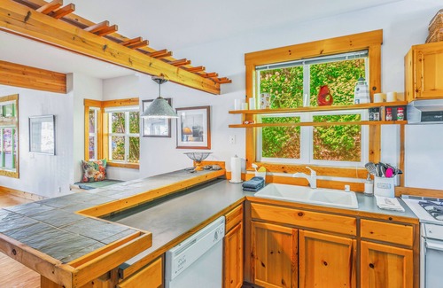 Inside, the living room couches encircle an enchanting gas fireplace with a river rock surround. The gracious dining room seats five, plus there's a breakfast bar where guests can chat with the chef in your group. The kitchen has a full suite of appliances and plenty of dinnerware, pots, pans and utensils to ensure the cook has all the tools needed. If your group is more inclined to dining out, Port Ludlow is just minutes away.