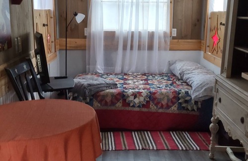 This Glide cabin boasts 1 inviting bedroom with 1 full bed and 1 twin bed. The cozy interior creates a serene atmosphere perfect for unwinding after a day of exploring. With AC to keep you cool, this retreat offers a phenomenal escape from the hustle and bustle of everyday life. We hope you enjoy what our place and Glide has to offer.