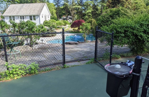 1,000 square feet of private air conditioned and heated space with its own entrance. The space is private and separated from the main residence. It is fresh, airy, and cheerful with 16 ft. ceilings, 1 bedroom with a large closet, a full bath, kitchen, laundry, and a 75-inch TV. Enjoy full access to a resort-like property that is among the most beautiful in Westport. Also enjoy a large heated pool with chaises, tennis court, pickleball, basketball, hot tub, BBQ, fire pit, & biking. Wakeman Park, the Town Farm, and The Porch, a country store with great food, are all a short walk away. The accommodations, the location, and the property will please even the most demanding travelers.
